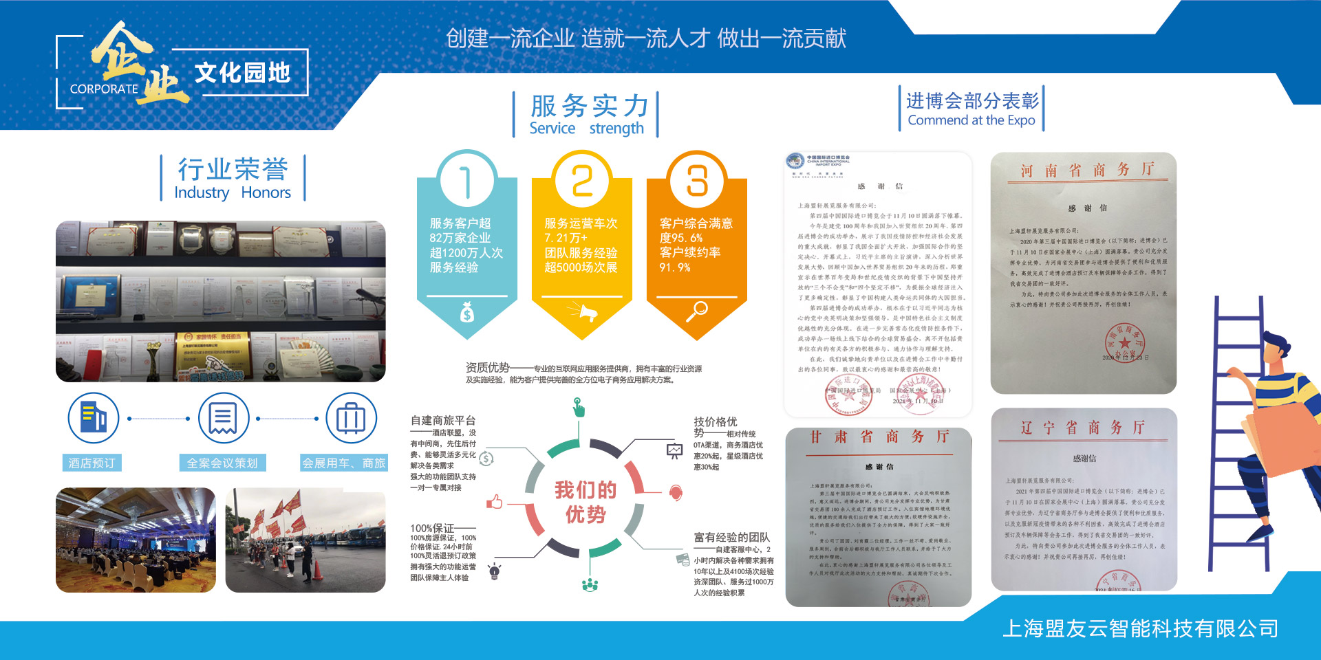 簡介:上海盟軒展覽服務有限公司成立于2009年,是一家 深耕于會展行業,專為會展商旅客戶在展會期間管 理酒店預定、商務出行安排、餐食供應管理,會務 策劃執行的專業服務商。